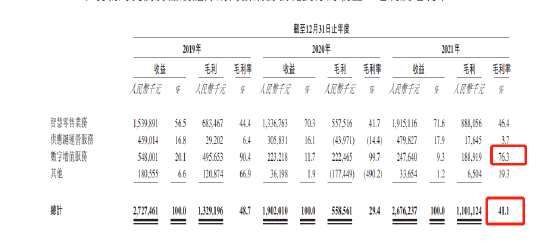 2)供應(yīng)鏈運營服務(wù),該分部的收益主要來自商品批發(fā)、機器銷售及租賃及╱或相關(guān)硬件支持服務(wù)收費,以及移動設(shè)備銷售,該部分收入占比超15%,2021年實現(xiàn)收入4.8億元,但毛利率低至3.7%。