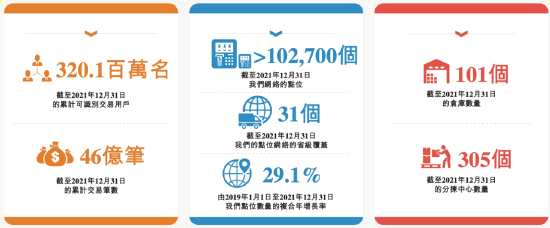 截至2021年12月31日,友寶已建立101個倉庫及 305個分揀中心,擁有629輛自有車輛和超過1,260名運營人員,覆蓋中國173個城市及27個省級行政區(qū),覆蓋合共85,139個友寶點位,并與13個知名國際快消品品牌開展戰(zhàn)略合作。