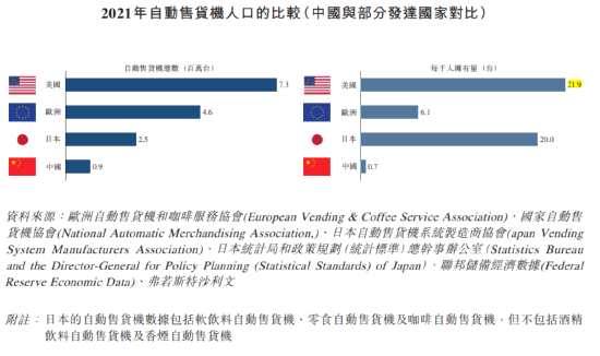 招股書數(shù)據(jù)顯示,中國無人零售市場滲透極低。于2021年,中國自動售貨機(jī)的每千人擁有量為0.7,而美國、歐洲及日本每千人擁有量則分別為21.9、6.1及20.0臺。