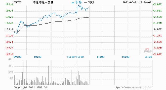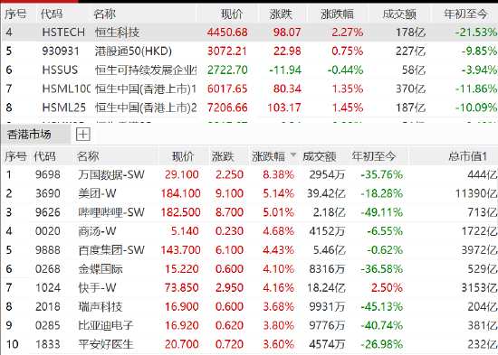 恒生科技指數(shù)午后漲幅擴(kuò)大至2.27%,萬國數(shù)據(jù)漲超8%,美團(tuán)、嗶哩嗶哩大漲逾5%,百度、快手等漲超4%。