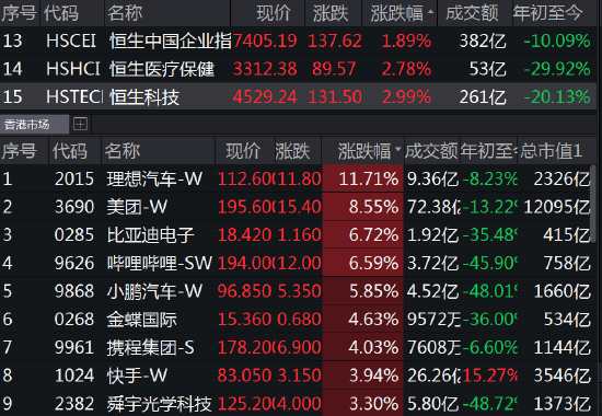 恒生科技指數(shù)漲幅擴大至3%,理想汽車漲12%,美團漲近9%