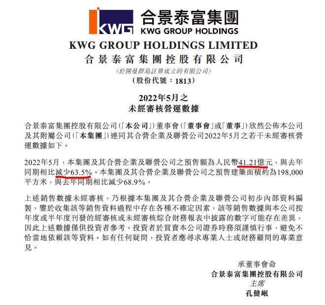 6月6日訊:合景泰富集團(tuán)控股有限公司(簡(jiǎn)稱:合景泰富集團(tuán),1813.HK)公告披露2022年5月未經(jīng)審核的運(yùn)營(yíng)數(shù)據(jù)顯示,2022年5月份,該集團(tuán)及其合營(yíng)企業(yè)及聯(lián)營(yíng)公司的預(yù)售額為41.21億元,較上月環(huán)比微降2.31億元,與去年同期相比減少63.5%減少約71.8億元;預(yù)售建筑面積約為19.8萬(wàn)平方米,與去年同期相比減少68.9%。