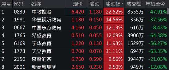 摘要: 2022年全國(guó)高考拉開(kāi)帷幕,教育股集體走高,中教控股暴漲23%,華夏視聽(tīng)教育漲15%,東方教育、希望教育漲12%,宇華教育、天立教育等漲11%,新高教集團(tuán)漲10%。