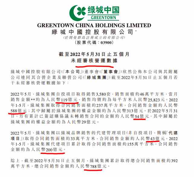 摘要: 6月7日訊:綠城中國(guó)控股有限公司(簡(jiǎn)稱:綠城中國(guó),3900.HK)公告披露截至2022年5月31日五個(gè)月未經(jīng)審核運(yùn)營(yíng)數(shù)據(jù)顯示,該公司截至2022年5月31日止五個(gè)月累計(jì)取得總合同銷售面積約392萬平方