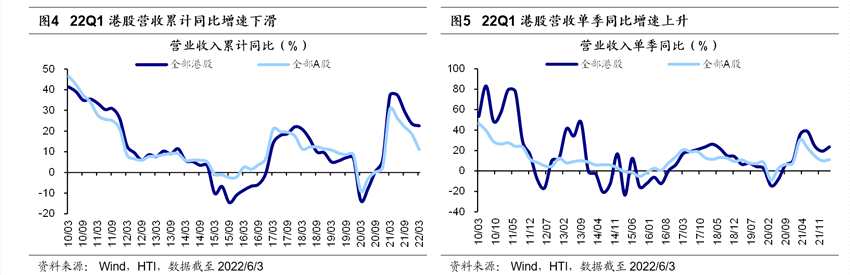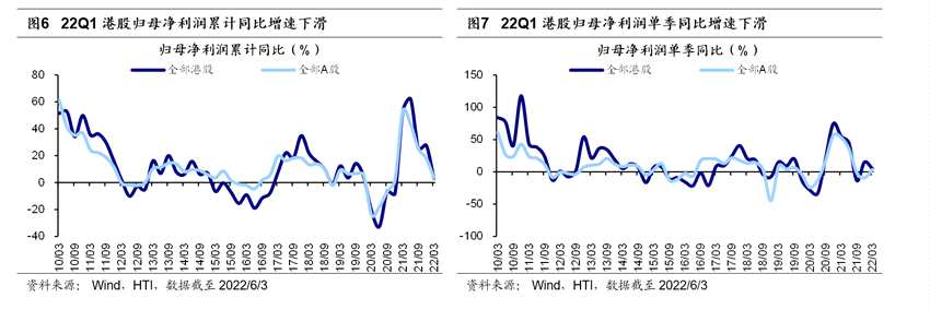 凈利潤方面,從累計同比角度看,一季度港股凈利潤增速大幅下滑,且幅度比A股更明顯。22Q1/21Q4全部港股歸母凈利潤累計同比分別為3.1%/27.8%(兩年年化8.4%),而全部A股為3.5%/18.1%(9.7%)。而從單季同比角度看,一季度港股盈利增速邊際趨弱,而A股則繼續(xù)回升。22Q1/21Q4港股歸母凈利單季同比分別為4.8%/15.0%(41.7%),而A股為3.5%/-9.4%(19.2%)。由此說明,經(jīng)濟下行和疫情沖擊之下,港股盈利增長受到的沖擊較A股更大。
