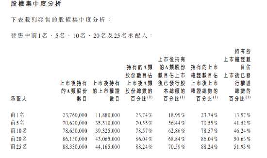 根據(jù)持股數(shù)據(jù),前25大承配人占發(fā)售股份的88.24%,占總股本的70.59%。最大承配人為AP China基金,持股18.99%,海通國際持股14.59%,Glory Assets Allocation基金持股12.4%,三者占到公司A類股份發(fā)售的55%。