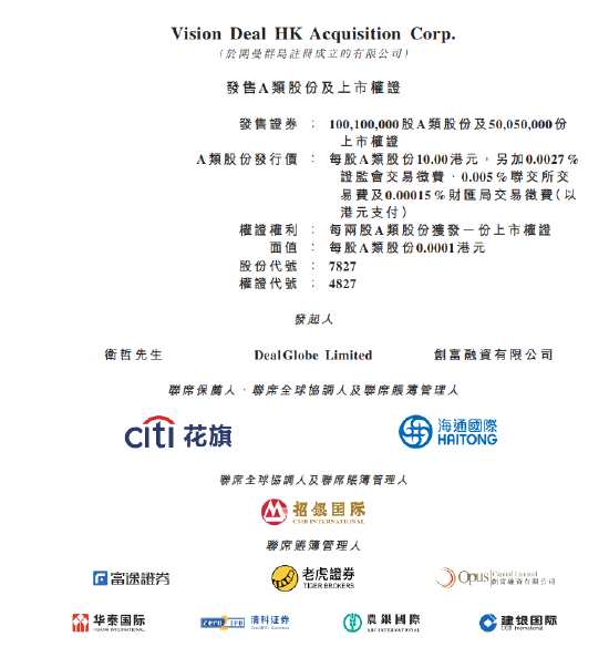 港股第二家掛牌的SPAC公司來了。特殊目的收購公司(SPAC)Vision Deal(07827)6月10日在主板掛牌,公司發(fā)售證券數(shù)目為1.001億股A類股份及5005萬份上市權(quán)證,股票代碼7827,上市聯(lián)席保薦人花旗及海通國際。
