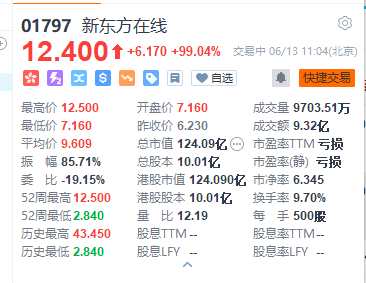 摘要: 6月13日消息,最近幾日最靚的仔非俞敏洪莫屬,最靚的股票非新東方在線莫屬,剛剛,新東方在線漲幅一度擴大至100%,股價達(dá)2021年6月以來最高,本月至今8個交易日新東方在線累計漲幅超200%,