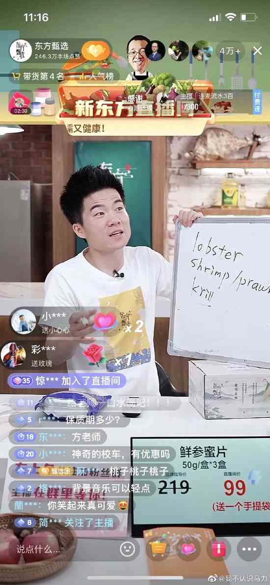 甚至還有網(wǎng)友表示,“今天為一名新東方下崗英語老師現(xiàn)網(wǎng)絡(luò)賣菜員動容了,他講述的一個小故事講哭了現(xiàn)場直播間的一位女老師,也讓屏幕前的網(wǎng)友們感動刷屏,同樣讓我這個老男人,老淚縱橫”。