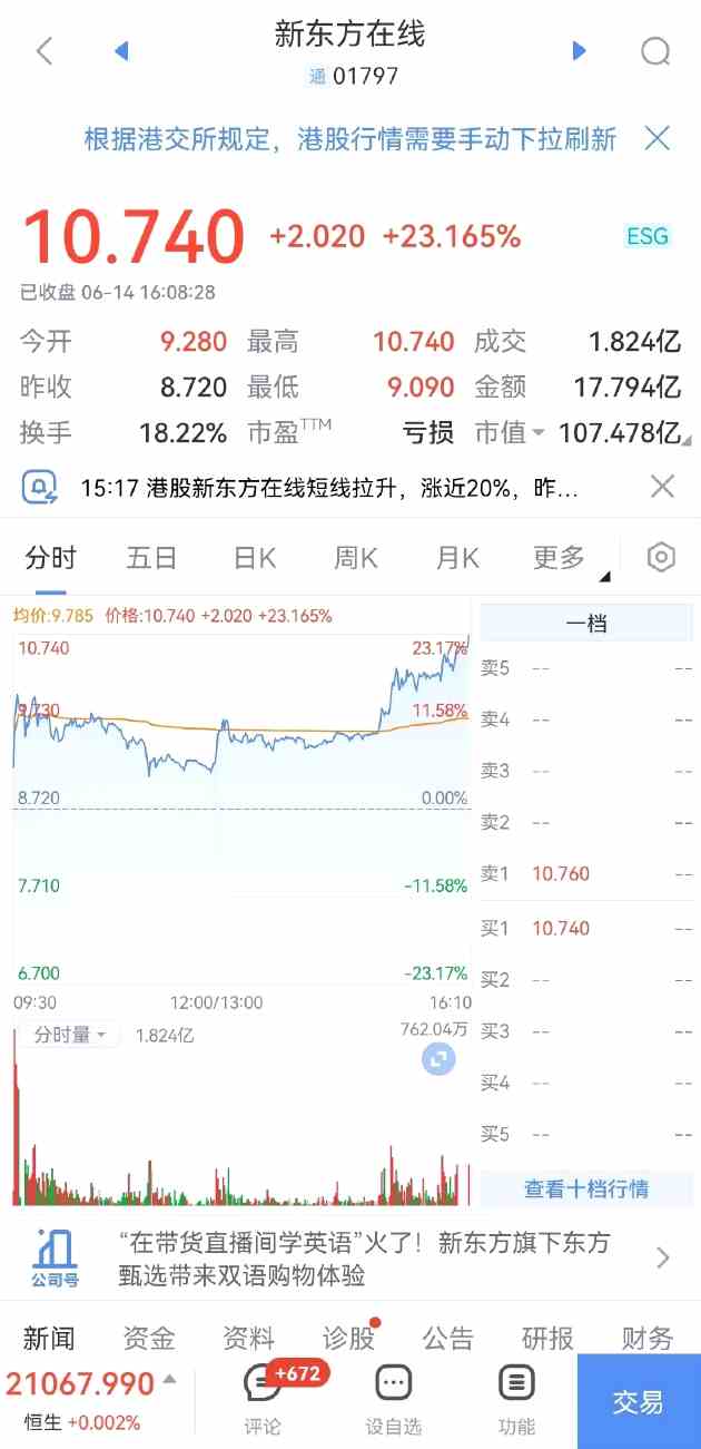 新浪科技訊 6月14日下午消息,香港恒生指數(shù)平收,恒生科技指數(shù)收跌0.06%。新東方在線收漲23%,延續(xù)強(qiáng)勢(shì)表現(xiàn)。