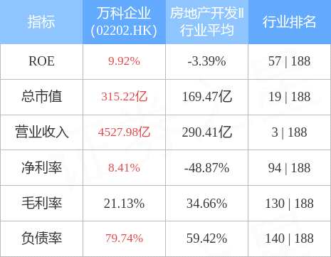 萬(wàn)科企業(yè)市值315.22億元,在房地產(chǎn)開(kāi)發(fā)Ⅱ行業(yè)中排名第19。主要指標(biāo)見(jiàn)下表: