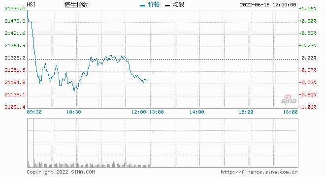 6月16日消息,美股周三收高,科技股漲幅領先。美聯儲宣布加息75個基點符合市場預期。香港金管局跟隨美聯儲加息,將基準利率上調75個基點至2.00%。今日港股高開低走,截至午盤,恒生指數跌0.40%,報21223.21點;國企指數跌0.51%,紅籌指數跌1.24%。