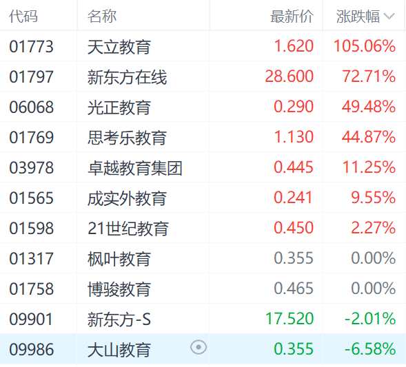在教育股中,除了大漲的新東方在線(01797.HK)之外,天立教育(01773.HK)、光正教育(06068.HK)、思考樂教育(01769.HK)分別上漲105.06%、49.48%、44.87%。