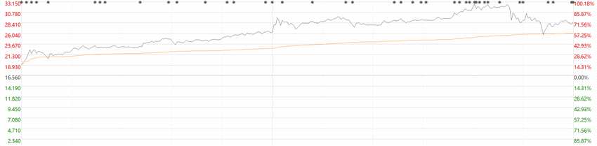 雖然港股市場(chǎng)受海外加息因素影響,但新東方在線延續(xù)大漲態(tài)勢(shì),盤中股價(jià)一度觸及33.15港元,截止收盤,該公司漲72.71%,報(bào)收28.6港元。