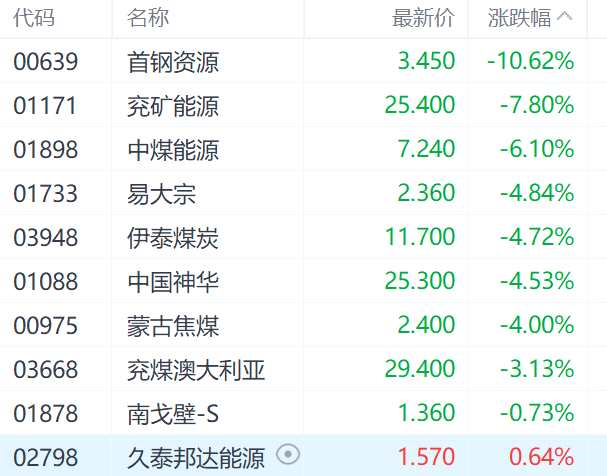 在煤炭股中,首鋼資源(00639.HK)跌10.62%、兗礦能源(01171.HK)跌7.80%,中煤能源(01898.HK)跌6.10%。