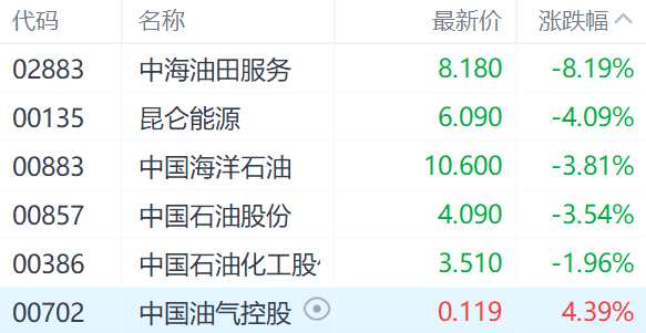 在石油股中,中海油田服務(wù)(02883.HK)跌8.19%、昆侖能源(00135.HK)跌4.09%、中國(guó)海洋石油(00883.HK)跌3.81%。