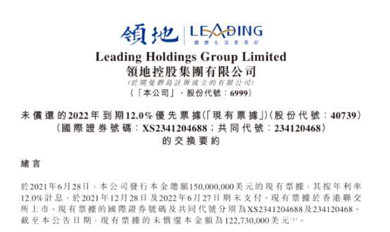6月16日訊(記者 孫晉)房企展期又添一例。6月13日,領(lǐng)地控股(6999.HK)公告稱,擬對2022年6月到期的一只美元債券尋求交換展期。