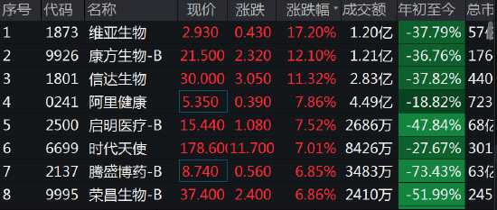 港股醫(yī)藥股集體爆發(fā),維亞生物漲超17%,康方生物漲超12%,信達(dá)生物漲超11%,阿里健康、啟明醫(yī)療、時代天使?jié)q超7%。