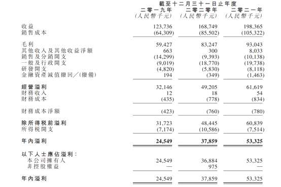 從公司毛利來看,在2019年、2020年、 2021年12日31日止三個年度中分別為5943萬元、8325萬元、9304萬元,其毛利率分別為48.0%、49.3%、46.9%。