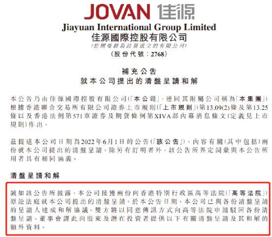 摘要: 佳源國際控股發(fā)布公告,6月1日,佳源國際控股接獲兩份清盤呈請,內(nèi)容有關(guān)一項(xiàng)聲稱公司到期應(yīng)付的債務(wù),總額約為1500萬港元。于本公告日期,本公司已與各份清盤呈請的呈請人達(dá)成和解協(xié)議。