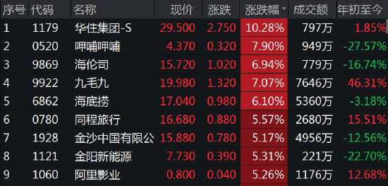 摘要: 港股消費(fèi)股爆發(fā),華住集團(tuán)漲超10%,呷哺呷哺漲8%,海倫司、九毛九漲7%,海底撈漲5%。