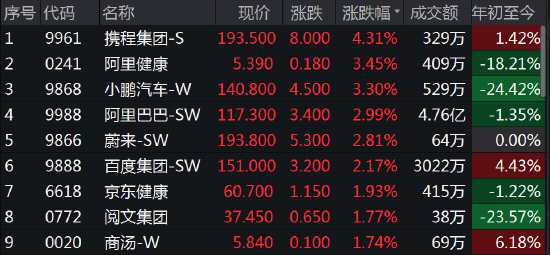 恒生科技指數(shù)漲1.28%,攜程集團(tuán)漲超4%,阿里健康、小鵬汽車漲超3%,阿里巴巴、蔚來(lái)等漲近3%。