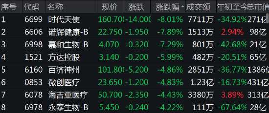 醫(yī)藥股集體回調,時代天使跌超8%,諾輝健康、嘉和生物跌超7%,百濟神州、微創(chuàng)醫(yī)療等跌超4%。