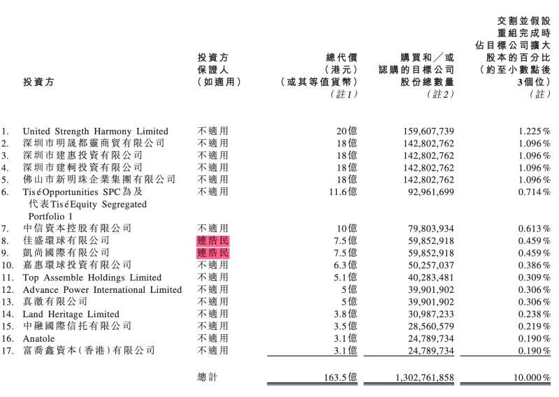 “連浩民”曾出現(xiàn)在恒大2021年3月29日發(fā)布的“房車寶引入戰(zhàn)略投資者”相關(guān)公告中,其作為投資方佳盛環(huán)球、凱尚國際的保證人。兩個(gè)投資方的投資總代價(jià)各別為7.5億港元。