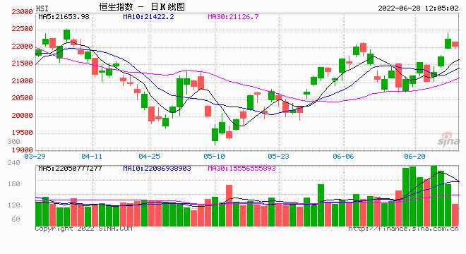 港股早上低開84點后,曾收窄至跌67點,恒指報22162。唯連升多日稍見回吐,再擴大跌幅,更曾失守22000關口,低見21952,最多跌277點。隨后反覆,在22000附近徘徊至收市。踏入本周,也接近月尾,首先是期指結算,隨后月結、季結及半年結亦同步進行。恒指近日受惠多個利好消息,和北水持續(xù)流入支持,連升3日,累升更超過1221點。高見22414,超越22000關口,更創(chuàng)近3個月高位。而恒生科技指數(shù)亦跟隨造好,累升超過520點,同沖上5000關口,高見5128,亦跟創(chuàng)出近4個月高位。昨日港股大幅造好,更有超過2,000億成交的配合,相信升勢仍可持續(xù)。