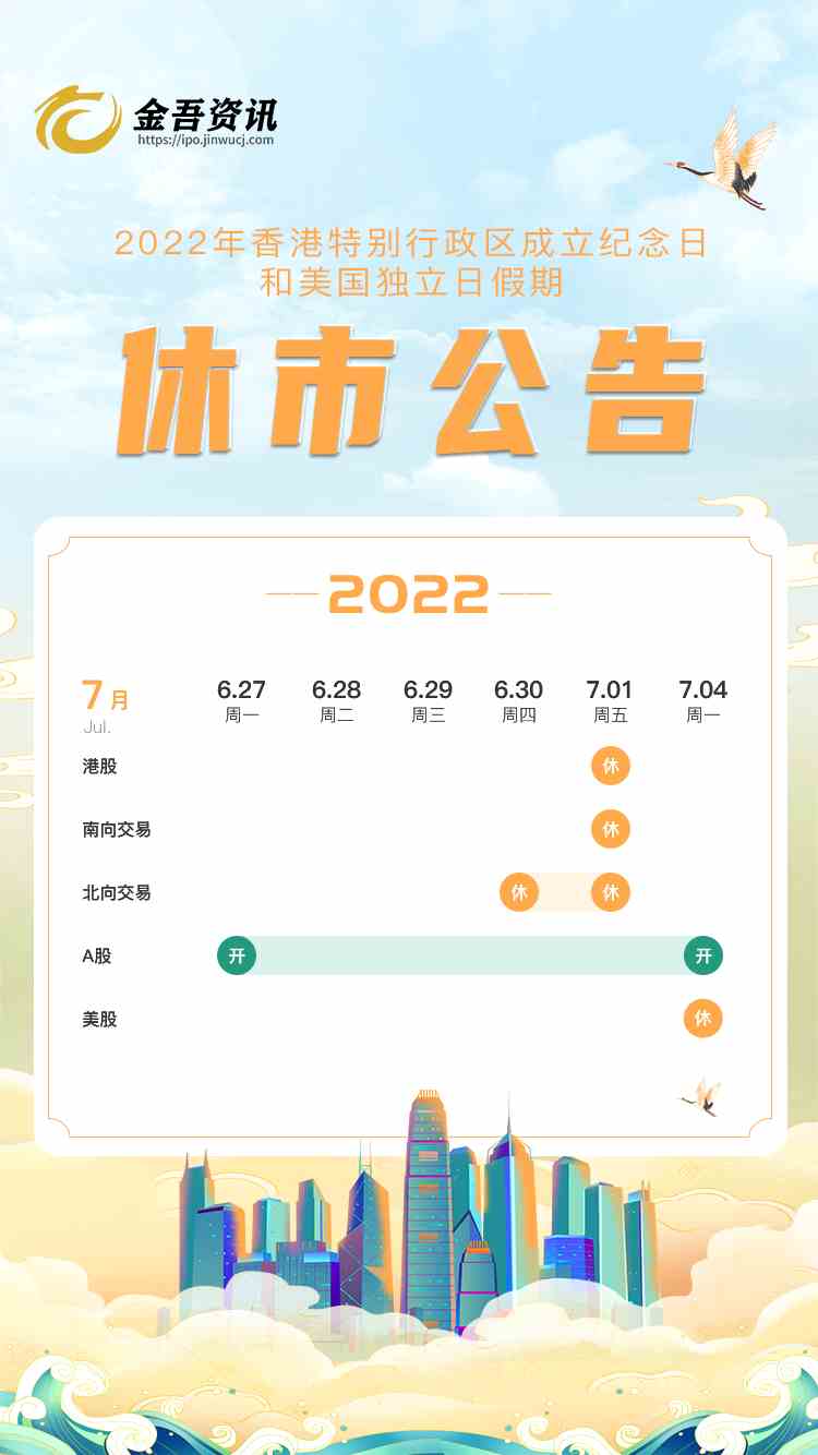 港股:7月1日(星期五,香港特別行政區(qū)成立紀(jì)念日)休市一日,7月2日-7月3日為周末休市。