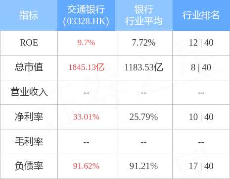 交通銀行市值1845.13億元,在銀行行業(yè)中排名第8。主要指標見下表: