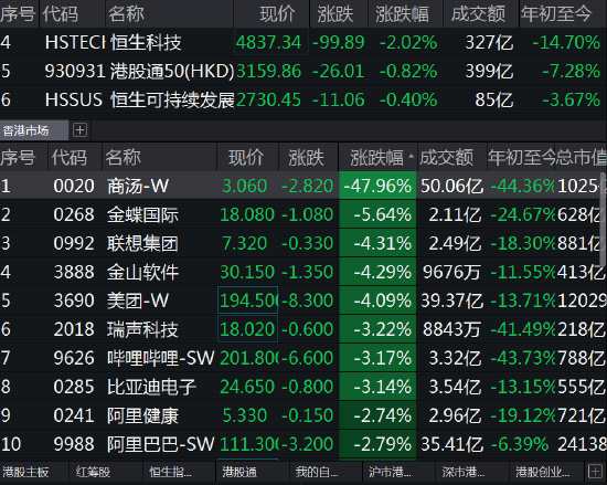 恒生科技指數(shù)午后跌幅擴(kuò)大至2%,商湯暴跌48%