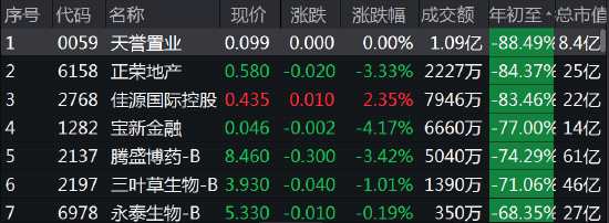 港股通中,內(nèi)房股領(lǐng)跌,天譽置業(yè)暴跌88%,正榮地產(chǎn)跌84%,佳源國際跌83%,除了地產(chǎn)就是醫(yī)藥,騰盛博藥跌74%,三葉草生物跌71%。