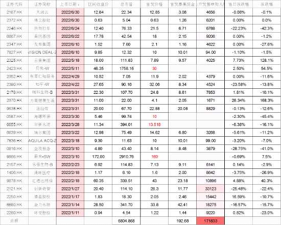 由于介紹上市新股沒有發(fā)行價,我們以4只新股開盤價粗略計為公司發(fā)行價,以此算出,2022年上半年公司,港股只有6只新股未破發(fā),其中1只股票無漲跌,破發(fā)率高達76.9%,上市首日破發(fā)率也超過50%。