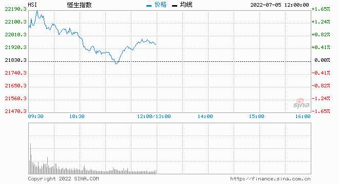 7月5日消息,昨晚為美國獨立日假期,美股休市。今日港股恒指高開1.02%,截至午盤,恒生指數漲0.57%,報21955.72點;國企指數漲0.35%,紅籌指數漲0.22%。