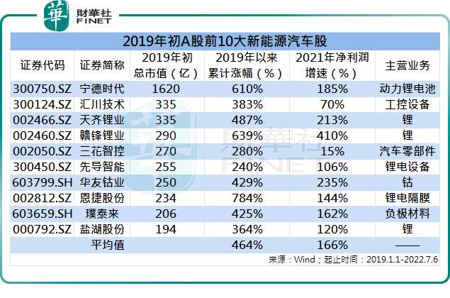 若以股價漲幅來計算,僅2019年以來,新能源汽車產業(yè)鏈中誕生了不少十倍股、二十倍股,例如,【德方納米(300769)、股吧】(300769)(300769.SZ)和天華超凈(300390)(300390.SZ)股價累計漲幅均超過2000%,二者主營業(yè)務均為鋰電材料;天賜材料(002709)(002709.SZ)和億緯鋰能(300014)(300014.SZ)股價累計漲幅均超過1000%,二者分別為電解液和動力鋰電池頭部公司。