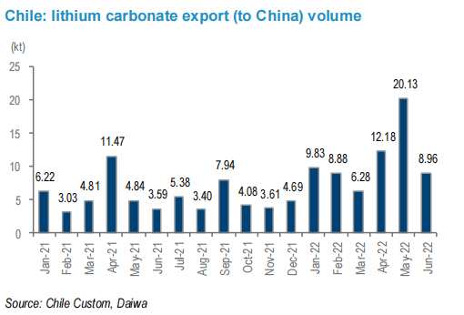 大和發(fā)研報(bào)指,據(jù)智利海關(guān)的最新數(shù)據(jù),2022年6月智利碳酸鋰出口(對(duì)華)均價(jià)環(huán)比下降5%至60.42美元/公斤,同比增長(zhǎng)839%,這仍然意味著40.5萬(wàn)人民幣/噸的超高價(jià)格水平。同時(shí),2022年6月智利碳酸鋰(對(duì)華)出口量下降56%,僅為9千噸,同比增長(zhǎng)150%。但該行續(xù)指,投資者不應(yīng)立即將平均售價(jià)和成交量的環(huán)比下降視作需求減弱。