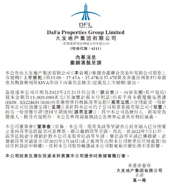 大發(fā)地產(chǎn)7月11日在港交所發(fā)布公告稱,高等法院命令撤銷針對本公司及垠壹的清盤呈請。