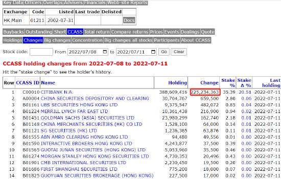 比亞迪跌幅不斷擴(kuò)大,A股大跌近6%,H股跌11%,港交所CCASS數(shù)據(jù)顯示,比亞迪股份2.25億股于7月11日被轉(zhuǎn)讓給花旗銀行。