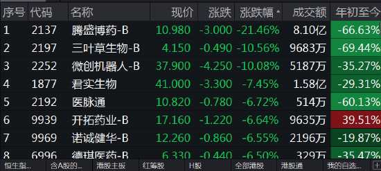 醫(yī)藥股集體暴跌,騰盛博藥跌超21%,三葉草生物、微創(chuàng)機(jī)器人(300024)跌超10%,君實(shí)生物、醫(yī)脈通、開拓藥業(yè)、諾誠健華等跌超6%。