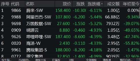 恒生科技指數(shù)大跌2.14%,蔚來跌超6%,阿里巴巴、萬國(guó)數(shù)據(jù)跌5%,明源云、嗶哩嗶哩、商湯等跌超4%。