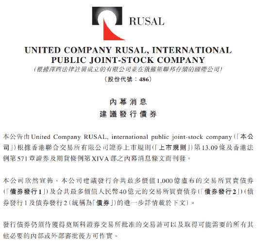 俄鋁擬發(fā)行兩筆債券,一筆最多價(jià)值1000億盧布的交易所買賣債券,一筆最多價(jià)值40億元的交易所債券,發(fā)行債券仍需去的莫斯科證交所批準(zhǔn)許可,債券不得在美國(guó)、加拿大、澳洲、日本派發(fā)。
