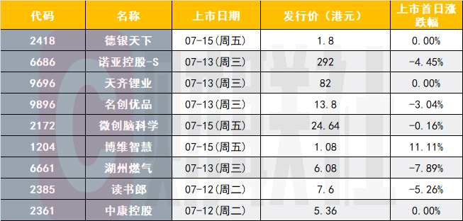 7月17日訊(編輯 周新旸)本周(7月11日至7月17日),沒(méi)有公司在港交所招股,3家遞表,也無(wú)通過(guò)聆訊的公司,9只新股上市。