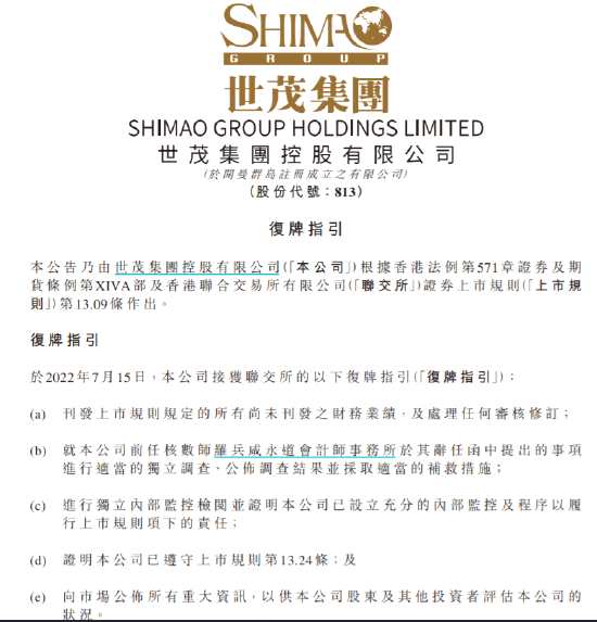 世茂集團(tuán)(00813.HK)公告稱,于2022年7月15日,本公司接獲聯(lián)交所的以下復(fù)牌指引,包括刊發(fā)所有尚未刊發(fā)之財(cái)務(wù)業(yè)績(jī),及處理任何審核修訂;就本公司前任核數(shù)師羅兵咸永道會(huì)計(jì)師事務(wù)所于其辭任函中提出的事項(xiàng)進(jìn)行適當(dāng)?shù)莫?dú)立調(diào)查、公布調(diào)查結(jié)果并采取適當(dāng)?shù)难a(bǔ)救措施等內(nèi)容。本公司正采取適當(dāng)措施遵守復(fù)牌指引及相關(guān)上市規(guī)則,并將適時(shí)作出進(jìn)一步公告告知公眾最新發(fā)展情況。本公司股份將繼續(xù)暫停買(mǎi)賣,直至另行通知。