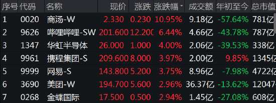 恒生科技指數(shù)漲1.56%,商湯大漲逾10%,嗶哩嗶哩漲6%,華虹半導體、攜程集團漲4%,網(wǎng)易漲近4%,美團漲近3%。