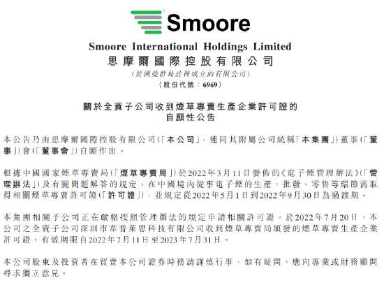 思摩爾國際:子公司收到煙草專賣局頒發(fā)的煙草專賣生產(chǎn)企業(yè)許可證