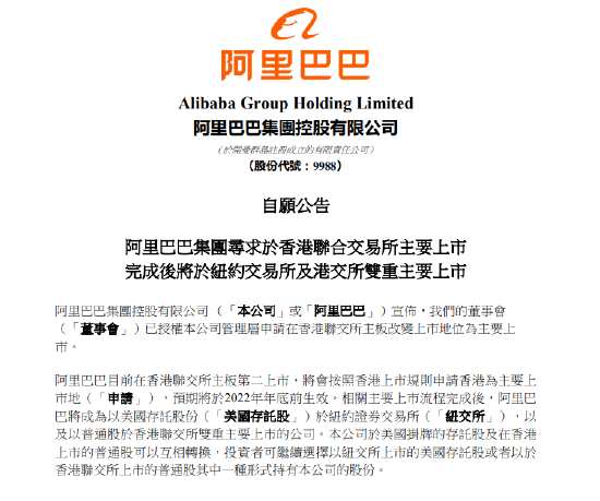 7月26日,阿里發(fā)布公告稱:董事會(huì)已授權(quán)集團(tuán)向港交所提交申請(qǐng),將新增香港為雙重主要上市地。在港交所完成審核程序后,阿里將在港交所主板及紐交所兩地雙重主要上市。公告顯示,相關(guān)流程預(yù)計(jì)在2022年年底前完成。其后,阿里在美國(guó)掛牌的存托股和在香港上市的普通股將可以繼續(xù)互相轉(zhuǎn)換。投資者可繼續(xù)選擇以其中一種形式持有阿里股份。阿里集團(tuán)董事會(huì)主席兼首席執(zhí)行官?gòu)堄卤硎荆何覀儗?duì)中國(guó)的經(jīng)濟(jì)和未來(lái)充滿信心。希望讓更廣泛多元的投資者,能共享阿里的成長(zhǎng)和未來(lái)。