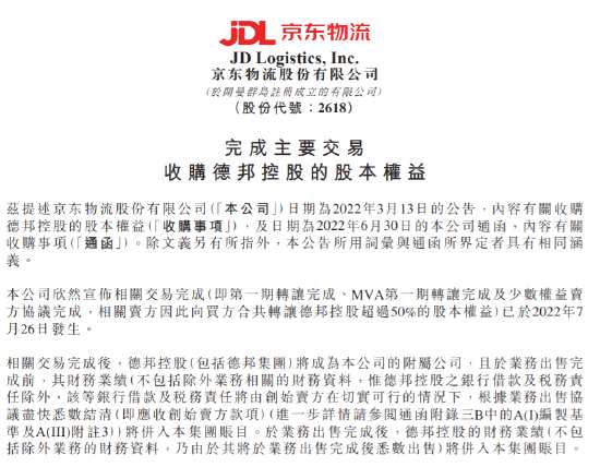京東物流:完成收購德邦控股逾50%股權(quán)