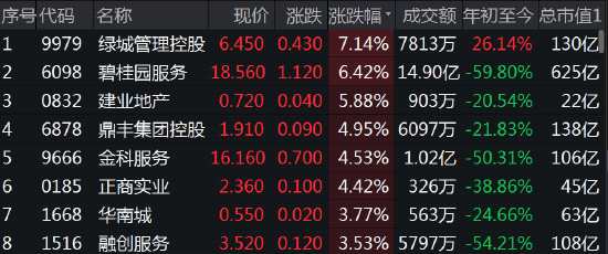 部分龍頭物業(yè)股走高,綠城管理漲超7%,碧桂園服務(wù)漲6.4%,金科服務(wù)漲超4%,融創(chuàng)服務(wù)漲3.5%。