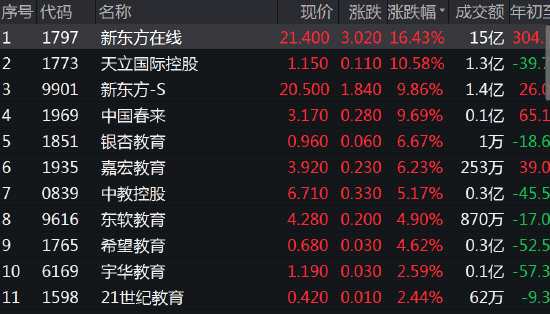 教育股集體爆發(fā),天立控股大漲10.58%,新東方在線漲16.43%,新東方漲10%,中國春來等漲9.69%。天風(fēng)證券(601162)表示,當(dāng)前,賬號公司化,主播去頭化,供應(yīng)鏈及運(yùn)營標(biāo)準(zhǔn)化或是未來直播電商主要趨勢,東方甄選等機(jī)構(gòu)具備較好的成長前景。
